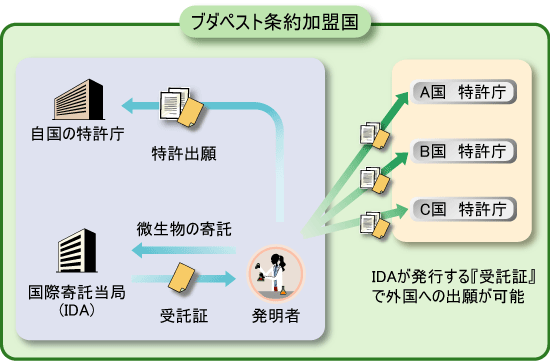 外国へ特許出願する場合、ひとつの国際寄託当局*に微生物を寄託することで、各締約国においてその国際寄託当局が発行する『受託証』の効果を認め合うことを主たる目的としています。(下図参照)