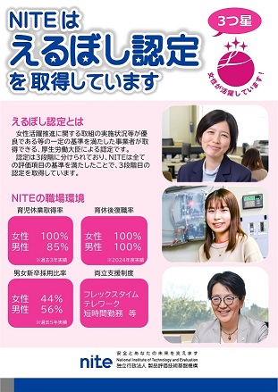 NITEは、女性活躍推進に関する取り組みの実施状況などが優良な事業主として評価され、厚生労働省が認定する「えるぼし認定」において、令和6年5月22日に認定段階3(3つ星)を取得しました。